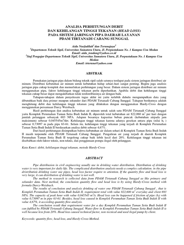 Analisa Perhitungan Debit Dan Kehilangan Tinggi Tekanan Head Loss