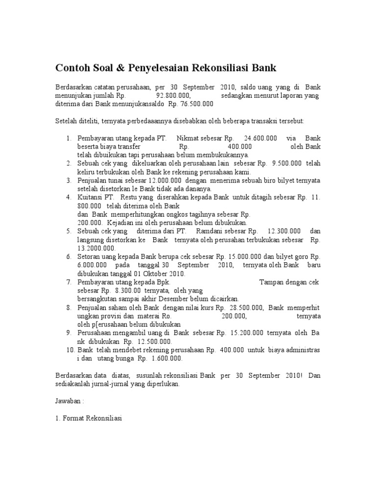 Pembahasan materi contoh soal rekonsiliasi bank dan jawabannya. Kondisi tersebut menyebabkan jumlah saldo. Laporan keuangan bank syariah.