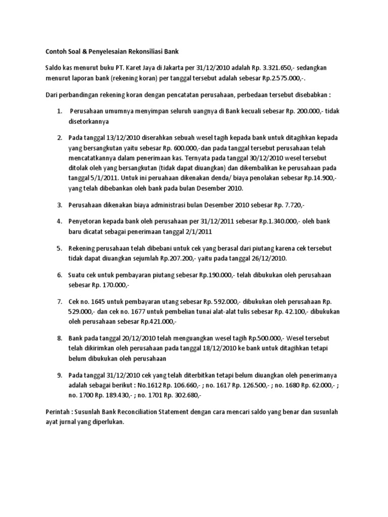 Contoh Soal Rekonsiliasi Bank Dan Cara Penyelesaiannya Kumpulan