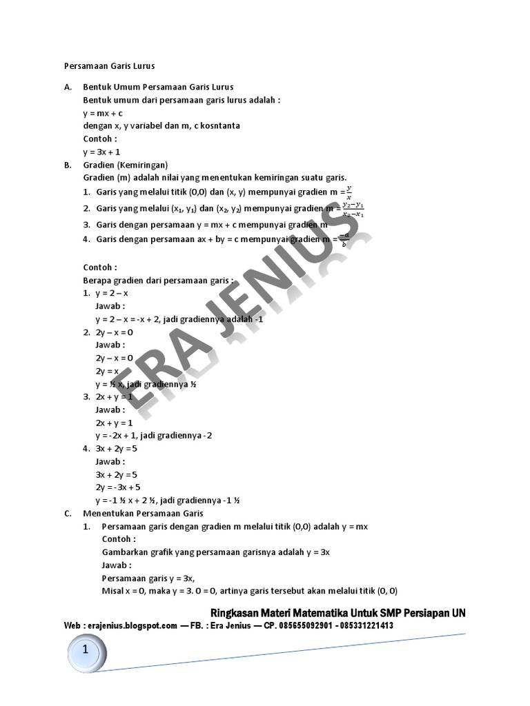 Contoh Soal Persamaan Garis Lurus Matematika Smp 1