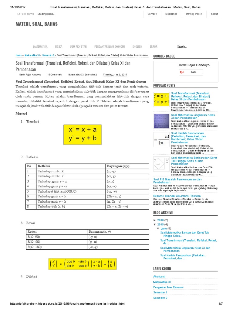 Soal Dan Pembahasan Refleksi Dan Dilatasi Matematika100 Blogspot Com