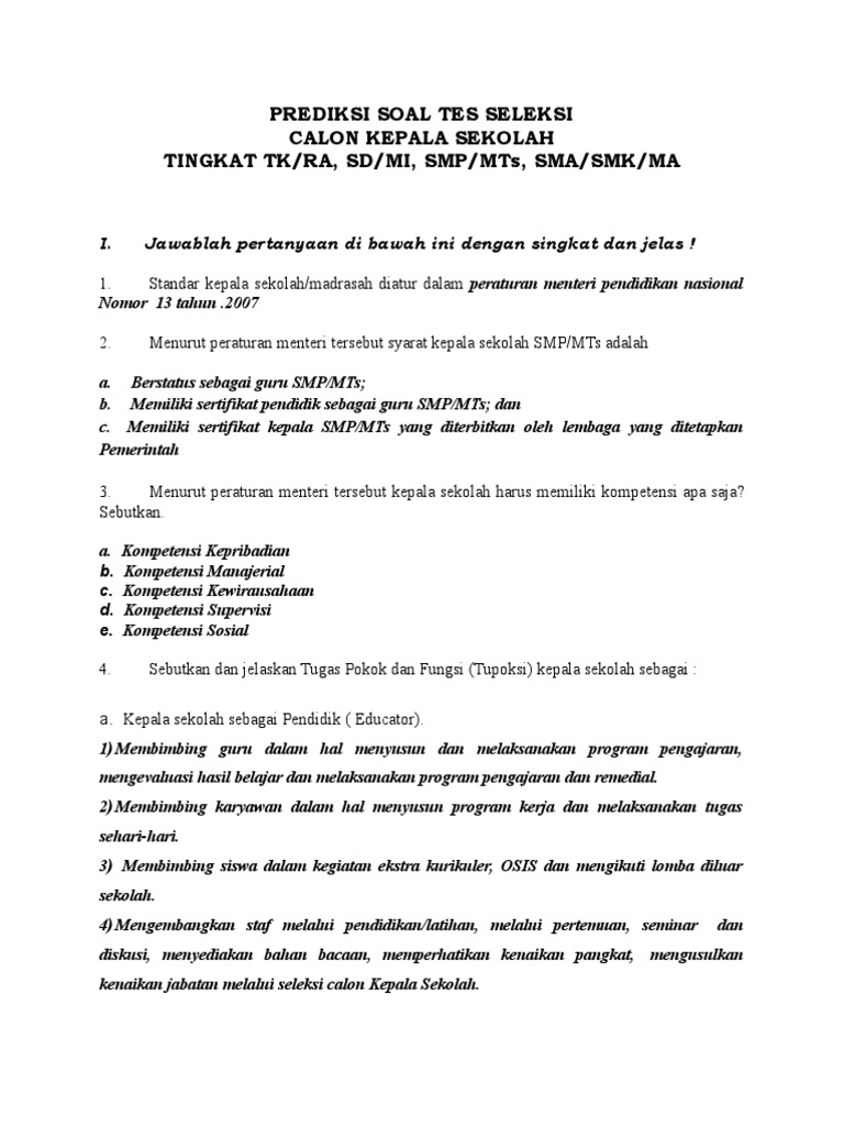 Soal Tes Calon Kepsek Prediksi Soal Tes Seleksi Docx