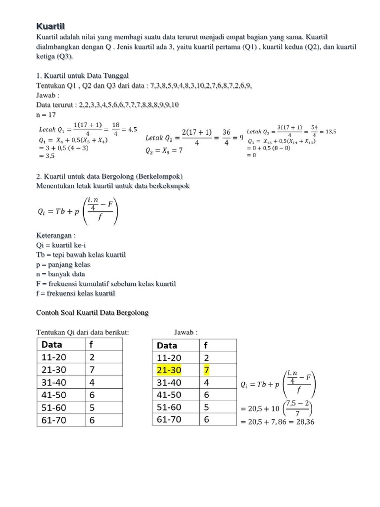 Berikut ini akan dikemukakan masing masing sebuah contoh perhitungan kuartil ke 1 ke 2 dan ke 3 untuk data yang tunggal dan kelompok. Oleh karena itu penentuan kuartil menggunakan kondisi kedua. Dapatkan pelajaran soal rumus kuartil data berkelompok lengkap di wardaya college.